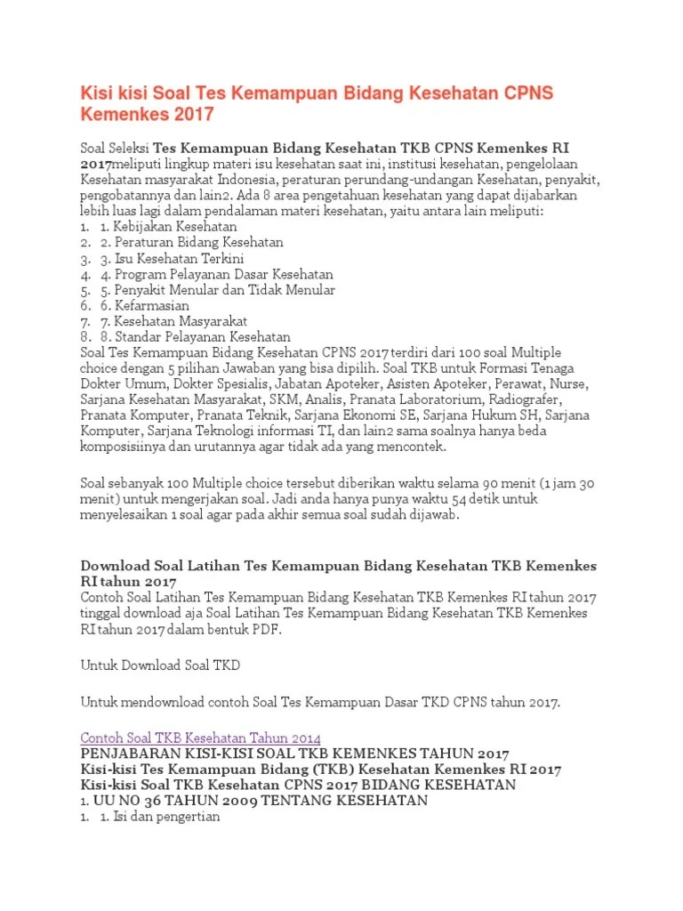 Soal skb / tkb kemenkes. Pengumuman materi pokok soal seleksi kompetensi bidang (skb) dengan computer assisted test (cat) untuk seleksi cpns kementerian kesehatan . Untuk mendapatkan secara lengkap 100 soal tes kemampuan bidang. Soal tes kompetensi bidang tkb cpns kementerian kesehatan bagian ii. Soal cpns tes kompetensi bidang(tkb)full description.